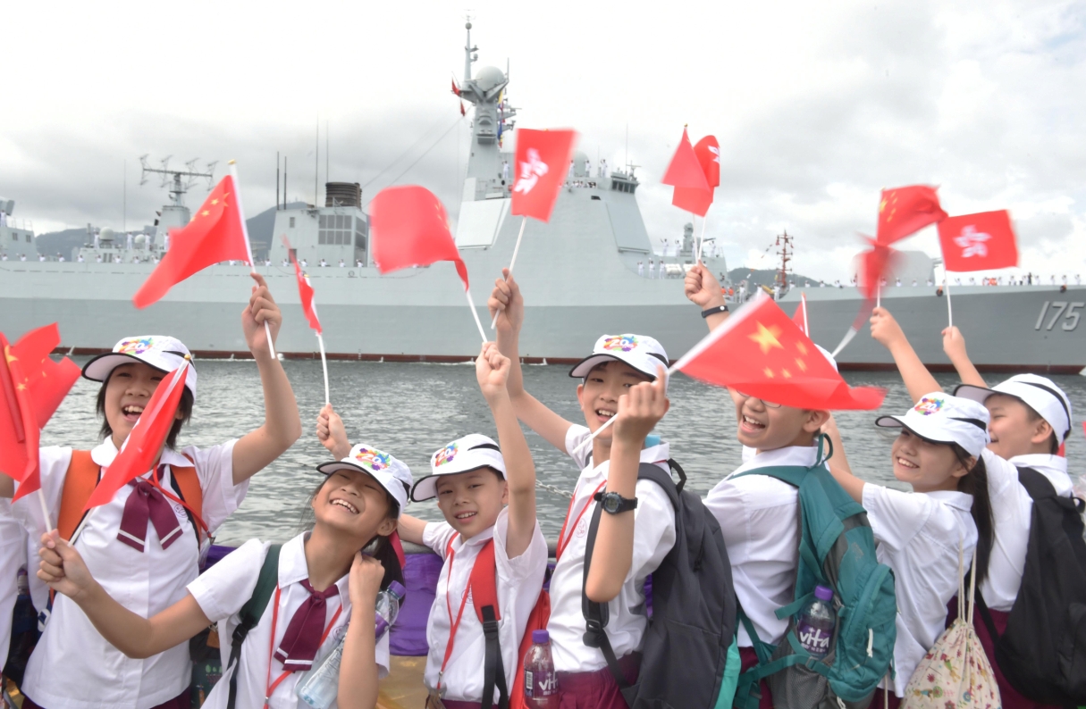 学生们挥旗欢迎航母编队。