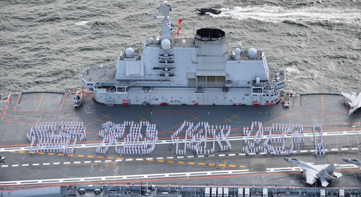 中国人民解放军辽宁舰编队昨日(七月七日)至七月十一日停靠香港。图为编队抵港时,船上官兵在甲板上砌出“香港你好”。GIS图片