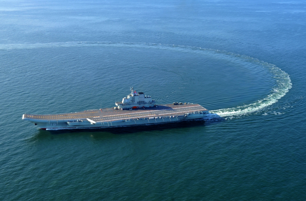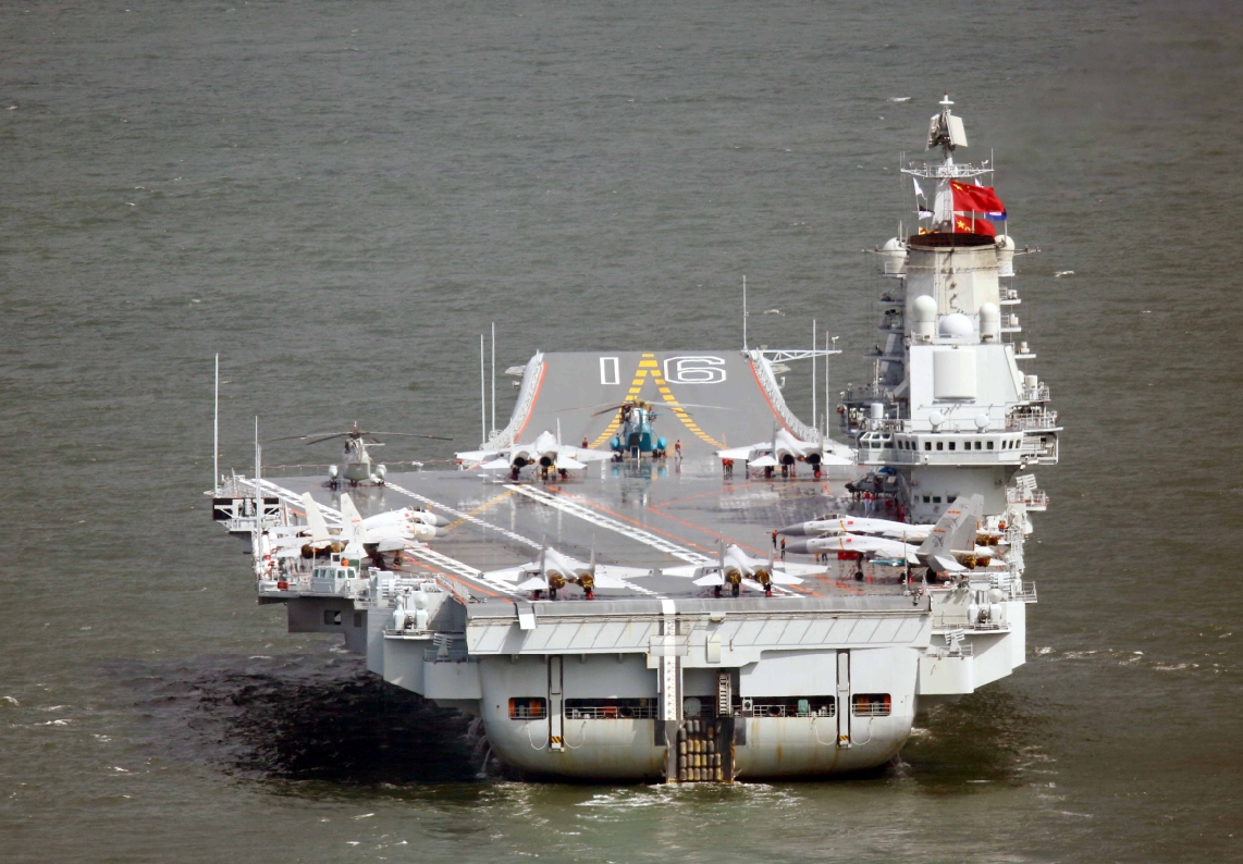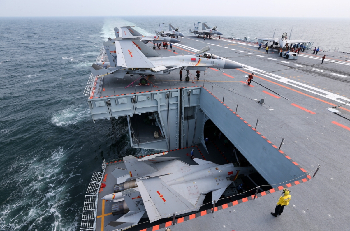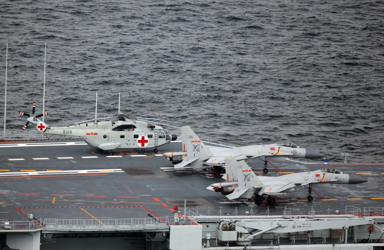 歼15舰载战斗机从辽宁舰飞行甲板起飞。