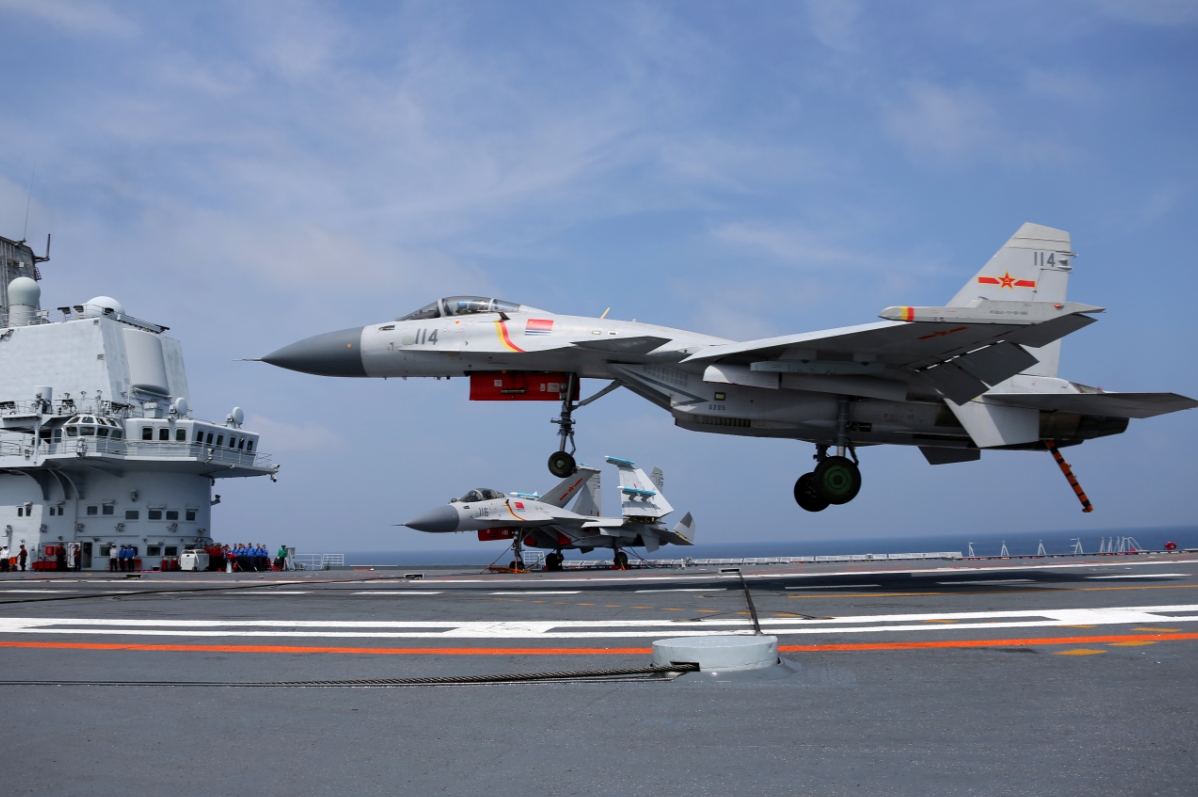 歼15舰载战斗机在辽宁舰即将阻拦着舰。