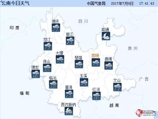 預計7月9日20時--7月10日20時:德宏、保山陰有大雨局部暴雨;臨滄、普洱、西雙版納陰有中雨局部大雨;昭通、曲靖多云間晴;其它地區多云有陣雨局部中雨。