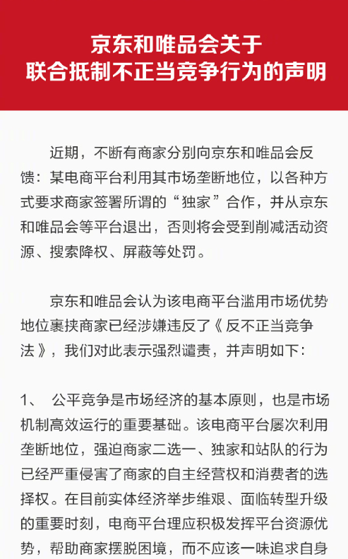 此次6.18的「二選一」風波昨日又有了下文,京東和唯品會在《關於聯合抵制不正當競爭行為的聲明》)中表示,近期不斷有商家分別向京東和唯品會反饋某電商平台利用其市場壟斷地位,以各種方式要求商家簽署所謂的「獨家」合作,并從京東和唯品會等平台退出,否則將會受到削減活動資源、搜索降權、屏蔽等處罰。