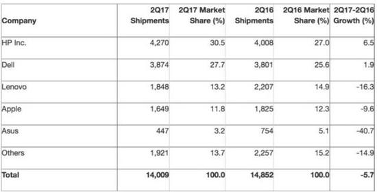 2017Q2 PC出貨量下滑4.3% 惠普登榜首