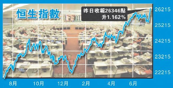 恒指在踏入7月份之后曾經有調整,但下試至25200點水平已見支持,而且反彈速度頗急,今周恒指已連續4個交易日上升,急升1000點,成交亦平穩增加,昨天更守在26300點以上收巿,后巿仍有動力向上。