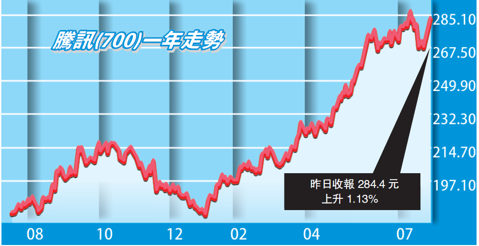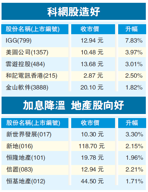 騰訊(700)四連升,高見286.4元,進一步逼近前段時間的高位288.4元,收市升1.14%,報284.4元,連續3天居成交榜首位。同業科網股亦造好,IGG(799)及美圖(1357)全日升約7.8%及4%。市場對美國加息預期降溫,地產股造好,新世界發展(017)搶高3.3%。
