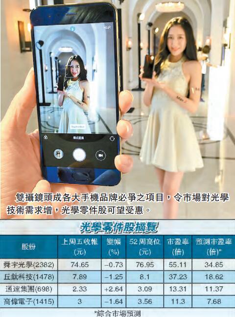 全球各大智能手機廠商面對更激烈的競爭,手機廠商紛紛改良技術和用戶體驗保障市場領先地位。面對市場日趨飽和,智能手機進一步強化硬件,特別在相機功能方面,已開始逐步取代相機,雙攝鏡頭成各大手機品牌必爭之項目。光學屬高技術產業,沒有一定的經驗和技術,市場競爭者難以進入分一杯羹,加上未來幾個月iPhone將推出新一代型號,舜宇光學(2382)、丘鈦科技(1478)和通達集團(698)值得留意。 香港商報記者 勞佩欣