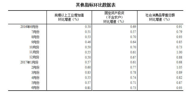 (2)根據季節調整模型自動修正結果,對近一年來各期國內生產總值、規模以上工業增加值、固定資產投資(不含農戶)、社會消費品零售總額環比增速進行修訂。修訂結果及2017年二季度GDP環比數據、2017年6月份其他指標環比數據如下: