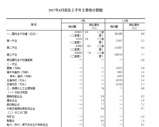 初步核算,上半年國內生產總值381490億元,按可比價格計算,同比增長6.9%。分季度看,一季度同比增長6.9%,二季度增長6.9%。分產業看,第一產業增加值21987億元,同比增長3.5%;第二產業增加值152987億元,增長6.4%;第三產業增加值206516億元,增長7.7%。從環比看,二季度國內生產總值增長1.7%。