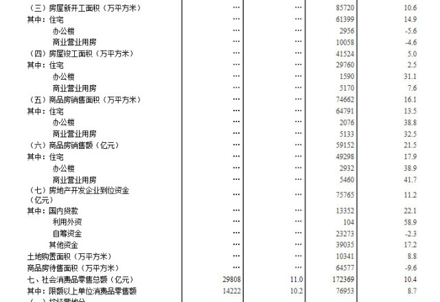 上半年,全國房地產開發投資50610億元,同比增長8.5%,增速比一季度回落0.6個百分點;其中,住宅投資增長10.2%。房屋新開工面積85720萬平方米,同比增長10.6%,其中住宅新開工面積增長14.9%。全國商品房銷售面積74662萬平方米,增長16.1%,其中住宅銷售面積增長13.5%。全國商品房銷售額59152億元,增長21.5%,其中住宅銷售額增長17.9%。房地產開發企業土地購置面積10341萬平方米,同比增長8.8%。6月末,全國商品房待售面積64577萬平方米,比上月末減少1441萬平方米。上半年,房地產開發企業到位資金75765億元,同比增長11.2%。