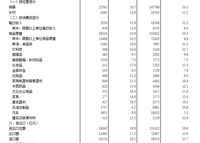 (5)社會消費品零售總額統計中限額以上單位是指年主營業務收入2000萬元及以上的批發業企業(單位)、500萬元及以上的零售業企業(單位)、200萬元及以上的住宿和餐飲業企業(單位)。