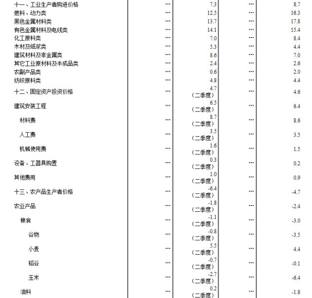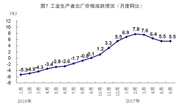 上半年,全國工業生產者出廠價格同比上漲6.6%,漲幅比一季度回落0.8個百分點。6月份,全國工業生產者出廠價格同比上漲5.5%,漲幅與上月持平,環比下降0.2%。上半年,全國工業生產者購進價格同比上漲8.7%;6月份同比上漲7.3%,環比下降0.4%。