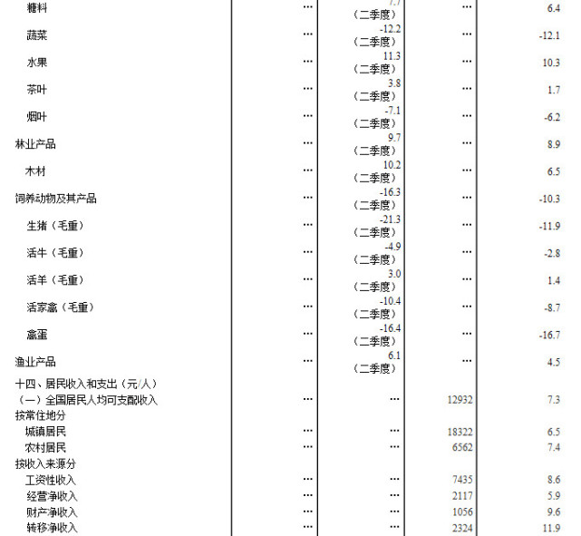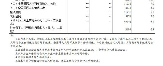 上半年,全國居民人均可支配收入12932元,同比名義增長8.8%,扣除價格因素實際增長7.3%,增速比一季度加快0.3個百分點,比上年同期加快0.8個百分點。按常住地分,城鎮居民人均可支配收入18322元,扣除價格因素實際增長6.5%;農村居民人均可支配收入6562元,扣除價格因素實際增長7.4%。城鄉居民人均收入倍差2.79,比上年同期縮小0.01。全國居民人均可支配收入中位數11238元,同比名義增長7.0%。全國居民人均消費支出8834元,同比名義增長7.6%,扣除價格因素實際增長6.1%。二季度末,外出務工農村勞動力總量17873萬人,比上年同期增加364萬人,增長2.1%。二季度,外出務工農村勞動力月均收入3405元,增長6.3%。