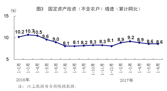 過剩產能有序化解,上半年全國工業產能利用率為76.4%,比上年同期提高3.4個百分點。房地產去庫存效果繼續顯現,6月末商品房待售面積同比下降9.6%,降幅比3月末擴大3.2個百分點。企業杠杆率下降,5月末規模以上工業企業資產負債率為56.1%,同比下降0.7個百分點。企業成本繼續降低,1-5月份規模以上工業企業每百元主營業務收入中的成本為85.62元,同比減少0.04元。短板領域得到加強,上半年生態保護和環境治理業、水利管理業、交通運輸倉儲和郵政業、教育投資同比分別增長46.0%、17.5%、14.7%和17.8%,均明顯快於同期固定資產投資增速。