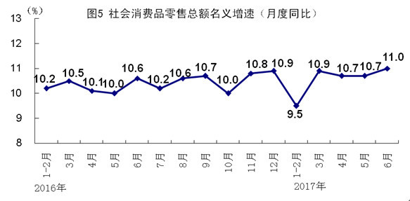 上半年,社會消費品零售總額172369億元,同比增長10.4%,增速比一季度加快0.4個百分點,比上年同期加快0.1個百分點。其中,限額以上單位消費品零售額76953億元,增長8.7%。按經營單位所在地分,城鎮消費品零售額147786億元,增長10.1%;鄉村消費品零售額24583億元,增長12.3%。按消費類型分,餐飲收入18546億元,增長11.2%;商品零售153822億元,增長10.3%,其中限額以上單位商品零售72420億元,增長8.8%。消費升級類商品銷售增長較快,文化辦公用品增長11.8%,體育娛樂用品增長17.1%,家具增長13.4%,建築及裝潢材料增長13.9%。6月份,社會消費品零售總額同比增長11.0%,比上月加快0.3個百分點,環比增長0.93%。
