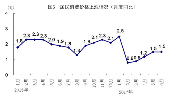 上半年,全國居民消費價格同比上漲1.4%,漲幅與一季度持平。其中,城市上漲1.5%,農村上漲1.0%。分類別看,食品煙酒價格同比下降0.8%,衣著上漲1.3%,居住上漲2.4%,生活用品及服務上漲0.8%,交通和通信上漲1.5%,教育文化和娛樂上漲2.5%,醫療保健上漲5.4%,其他用品和服務上漲3.3%。在食品煙酒價格中,糧食價格上漲1.4%,豬肉價格下降6.1%,鮮菜價格下降14.7%。6月份,全國居民消費價格同比上漲1.5%,漲幅與上月持平,環比下降0.2%。