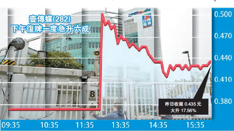 壹傳媒上周五股價突漲逾15%,收報0.37元。昨日早上宣布停牌,待公布出售《壹週刊》消息后,午后復牌。受消息刺激,壹傳媒復牌后一度狂升59.5%,高見0.59元,創逾一年半新高,收市0.435元,升17.5%。