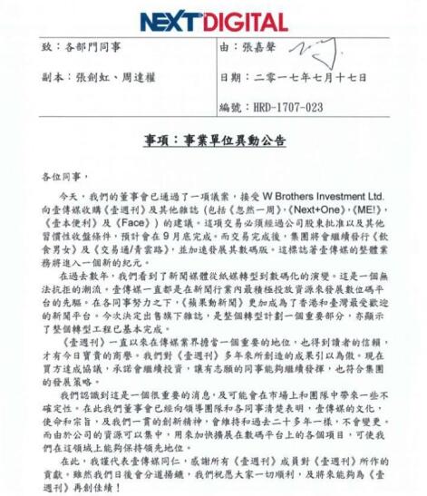 壹传媒向员工发出一封事业单位异动公告。