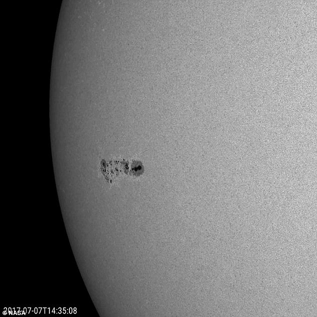 NASA太陽動力天文台於上周首次觀察到這塊巨大的太陽黑子,一直到本周仍未消除。太陽黑子是太陽表面亮度較暗、溫度較低的區域,由太陽磁場所引起。它們通常出現在磁場活動密集的區域,當其釋放能量時,太陽耀斑和劇烈的太陽風暴便會從太陽黑子中傾瀉而出。