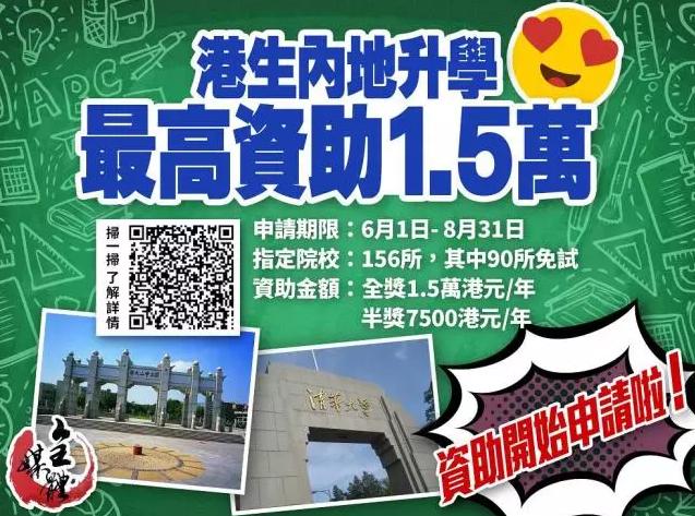香港教育局表示,会为有经济需要、通过入息审查,并已通过免试收生计划,到内地修读学士学位课程的香港学生提供每年1.5万元的全额资助,或7,500元的半额资助,即日起至8月31日接受申请。