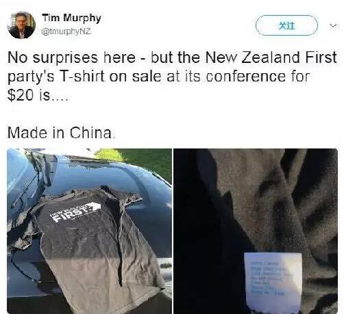 在7月15日的一篇推文中,墨菲發現了一條“大新聞”:“并不令人意外,新西蘭優先黨的競選集會上,標價20新元(約合人民幣99元)一件的T恤……是中國制造的。”