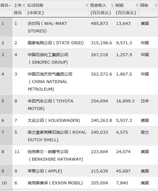 沃爾瑪連續四年排名第一位,2016年營業收入達4,858.7億美元,同比提升0.8%。前三陣營中的其它兩家為中國公司——國家電網和中石化。中石油和豐田汽車分列第四和第五。唯一新進入前十陣營的是沃倫•巴菲特掌管的保險和投資集團伯克希爾-哈撒韋公司。如今伯克希爾收入中近四分之三來自經營業務而非財務投資,在掙脫巴菲特光環方面又有進展。