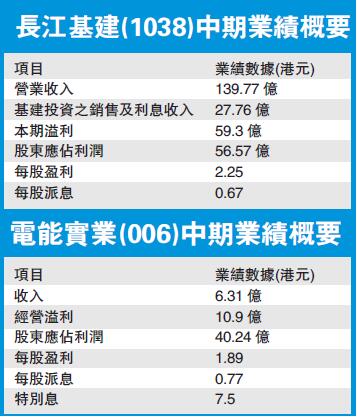 【香港商報网訊】記者鄭珊珊報道:李澤鉅執掌的長江基建(1038)昨日公布上半年業績,公司營業收入同比下降0.56%至139.77億元,股東應占利潤為56.57億元,按年上漲3%,每股盈利2.25元,每股派息按年增加6.3%,擬派0.67元,股息將於8月31日派發。
