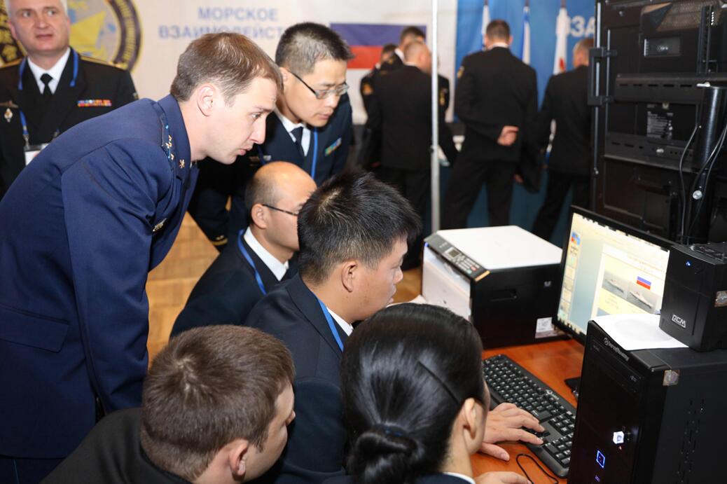 據環球網報道,當地時間一大早,中俄雙方工作組人員就在會議現場開始準備工作,有的在會議桌前就文件細節討論,有的在圖紙面前展開磋商。聯合指揮部副指揮員、南海艦隊作戰處副處長林龍接受記者採訪時表示,當天行動包括兩個戰術群向執行導演匯報行動決心,以及兩個戰術群通過圖上推演的方式就行動細節問題開展討論。