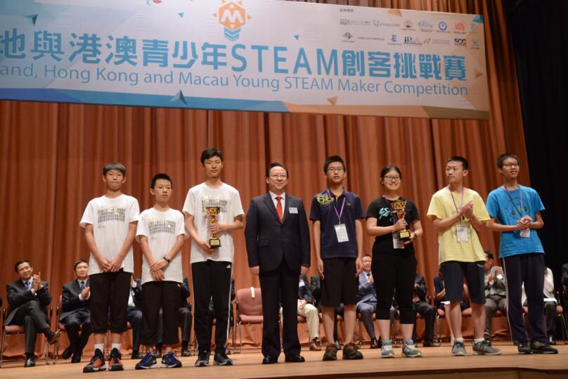 中聯辦副主任譚鐵牛(左四)出席內地與港澳青少年STEAM創客挑戰賽頒獎禮。記者崔俊良攝