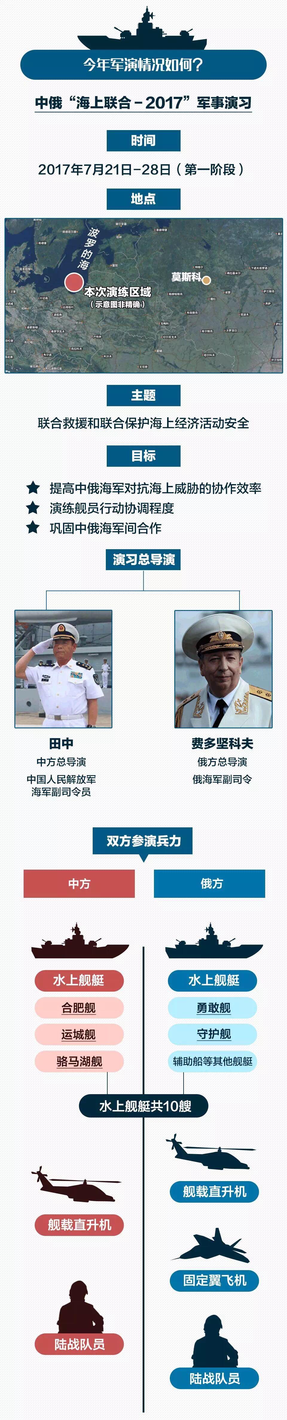 當地時間7月21日,中俄“海上聯合-2017”演習中方艦艇編隊抵達了俄羅斯波羅的斯克軍港。當地時間22日,演習開幕式在演習導演部舉行,中方總導演、海軍副司令員田中致開幕辭,俄方總導演、俄海軍副司令費多堅科夫致辭并宣布演習開始。