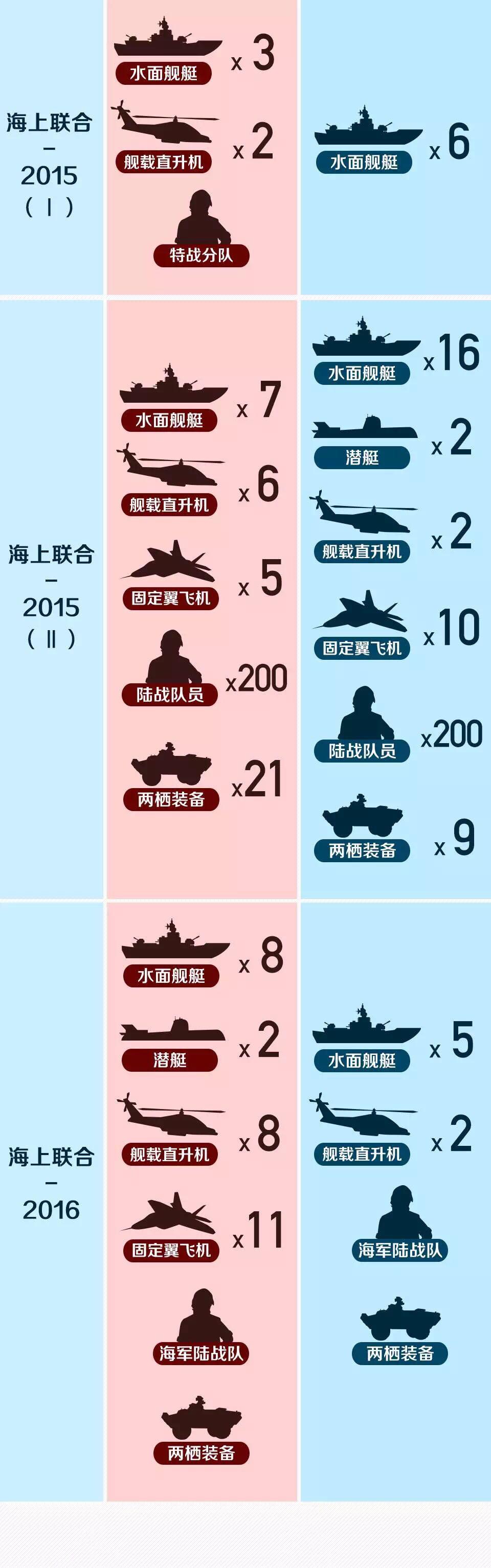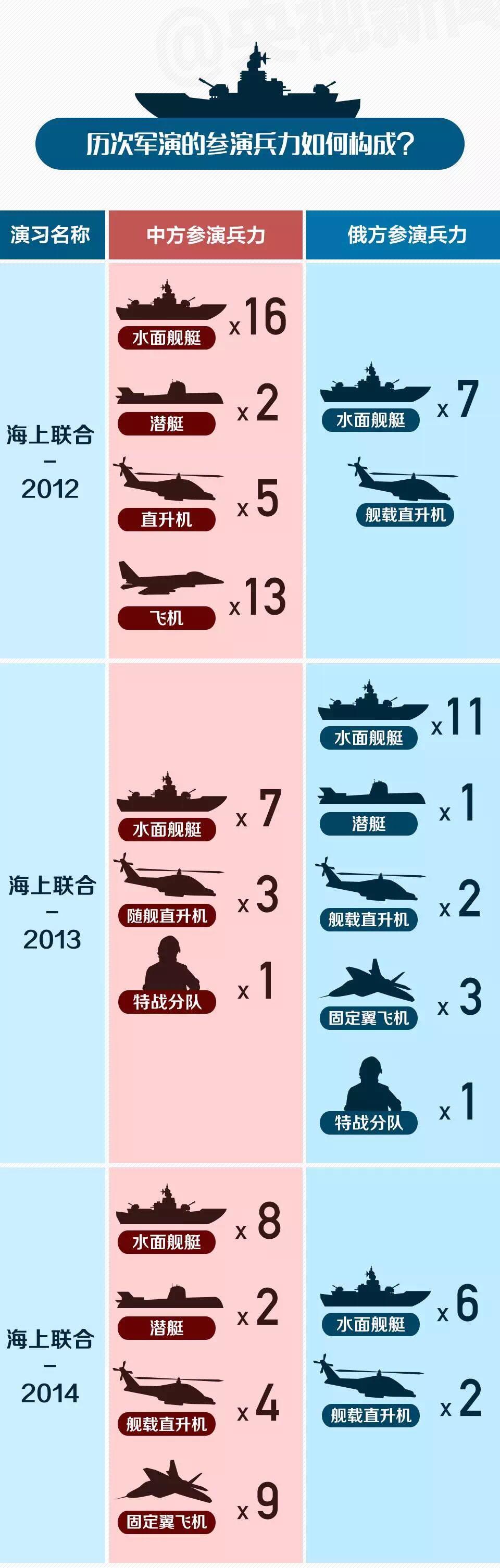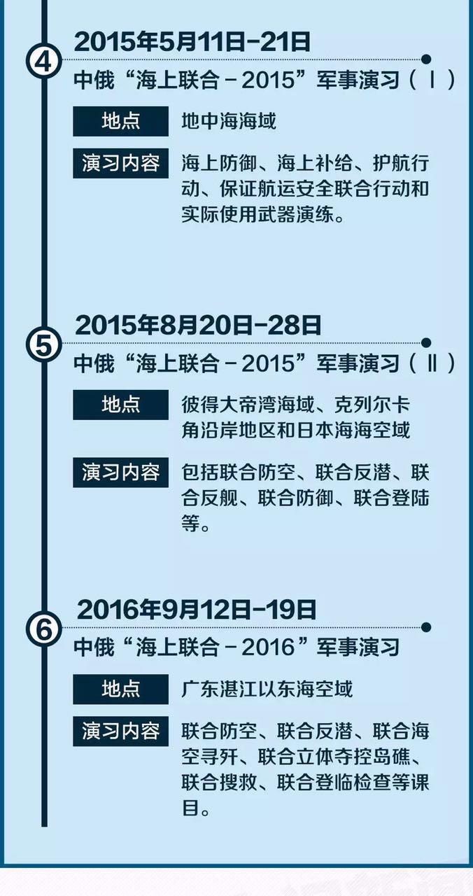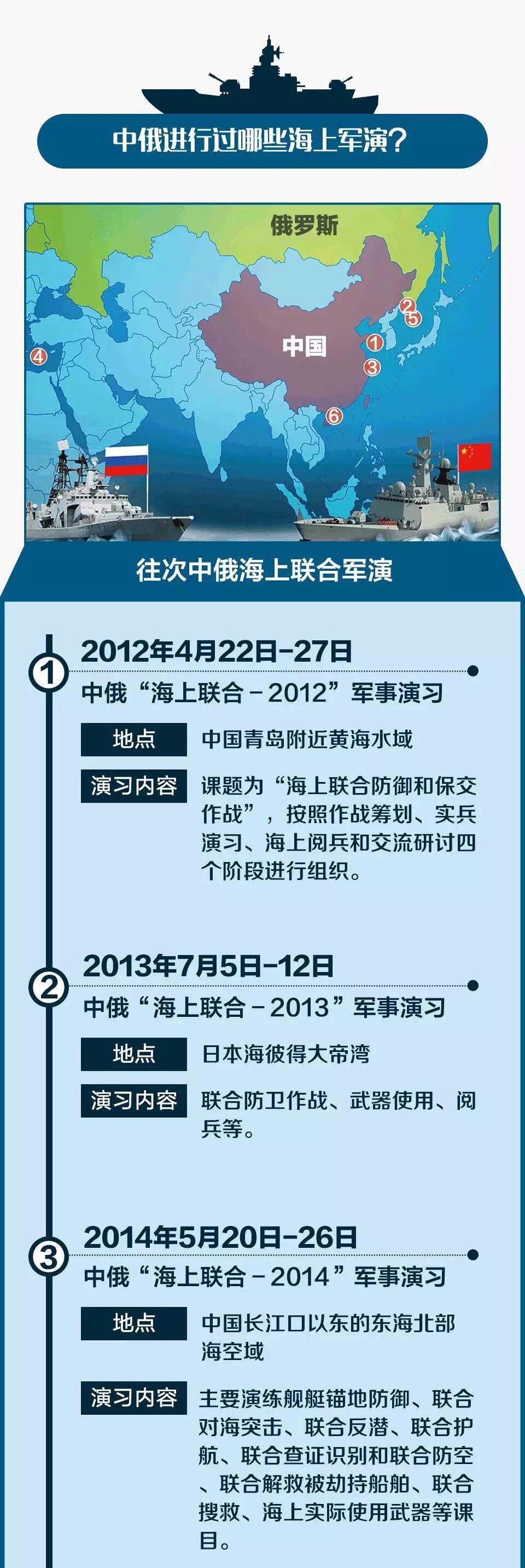 從2012年開始,中俄兩國輪流在自己國家及附近海域舉辦聯合軍演,每年都會舉行至少1場海上聯合演習。自2012年開始,兩國已經舉辦了6次海上演習(不包括今年這次)。