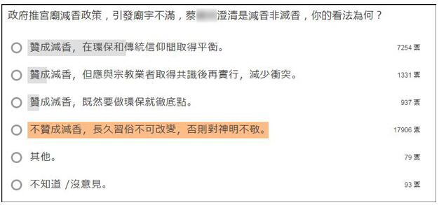 “宮廟滅香”的傳聞,引起台灣中南部不少寺廟和信眾反彈。民進黨“立委”陳亭妃聲稱,“滅香”是誤傳,“立委”莊瑞雄則說是“大誤會”,“滅”跟“減”的繁體字字形太像。有網友認為減香是沒錯,但注意“減到最后是零”。有網友認為“事情鬧大了才緊張滅火,如果說香火污染大那煙火不是更大,怎么到處放沒人管?”、“又見發夾彎!”、“民進黨黨是怕宗教覺醒,會比勞工覺醒更可怕”。