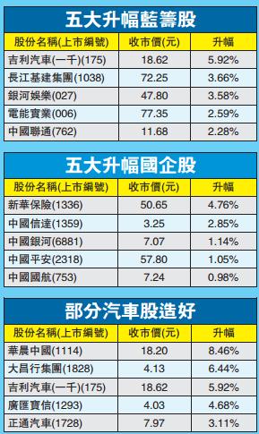 騰訊獲美銀美林唱好,股價再創新高支撐大市,收報302.2元,升1.7%,貢獻大市全日逾半升幅;中資金融股普遍上升,為大市增添動力,其中建設銀行(939)及工商銀行(1398)升0.9%及0.5%;中國平安(2318)及中國人壽(2628)升1%及0.6%。其他重磅藍籌表現牛皮,豐控股(005)及港交所(388)逆市偏軟。另外,吉利汽車(175)再踩油,收市升近6%,是表現最佳藍籌。