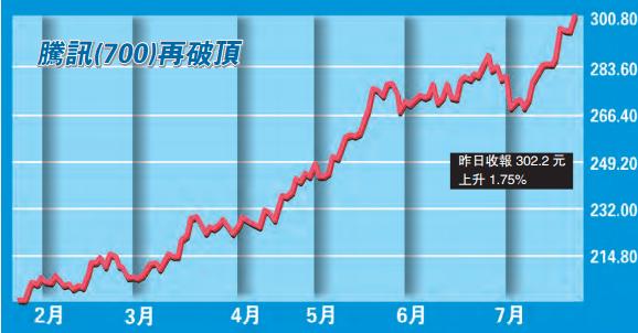 股王騰訊企穩300關 提振港股闖兩年新高