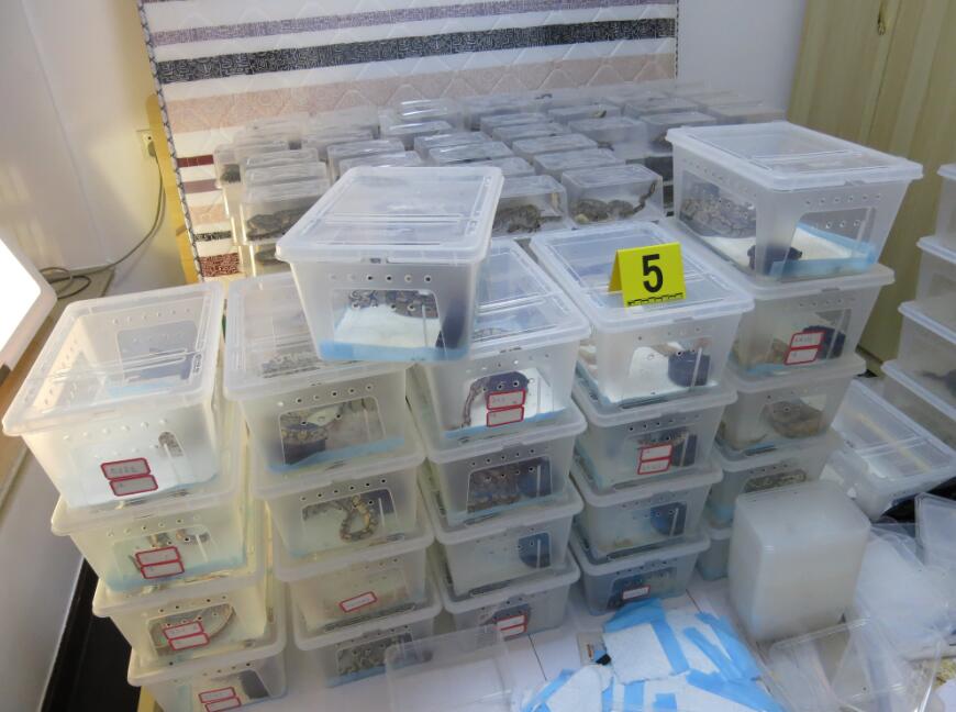 隨後,警方在劉某藏匿野生動物的窩點,查獲國家重點保護野生動物蟒蛇活體887條、疑似巨蜥214條。目前,犯罪嫌疑人劉某、李某等人因涉嫌非法運輸珍貴、瀕危野生動物罪被依法逮捕,案件正在進一步審理中。
