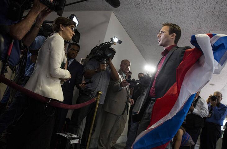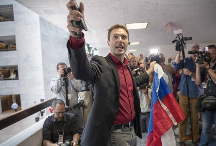 在現場,一名示威者Ryan Clayton手持俄羅斯國旗,試圖將旗幟拋向美國白宮高級顧問庫什納的面前。