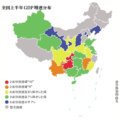 與全國6.9%的GDP增速相比,已公布數據的省份中有19個省份上半年GDP增速跑贏“國家線”。剩下的6個省份中,天津、上海和山西與“國家線”持平,北京、甘肅和遼寧分別比“國家線”低0.1、1.9和4.8個百分點。