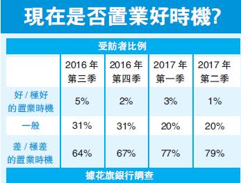 【香港商報网訊】記者鄭珊珊報道:花旗銀行委託香港大學社會科學研究中心,以隨機抽樣電話訪問形式,於2017年6月訪問超過500名香港市民。最新調查結果顯示,表示有興趣置業的受訪者連升三季后下跌至14%,比例回落至接近一年前水平。僅1%的受訪者認為現時是置業好時機;認為現時并非置業好時機的受訪者比例攀升至79%,比例創調查以來新高。