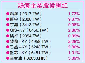 另外,在香港上市的鴻海旗下企業富智康同樣升近4%,收報2.67元。
