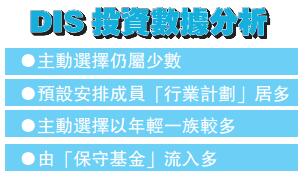 銀聯集團董事總經理及行政總裁劉嘉時表示,主動選擇投資DIS的客戶,不少是年輕人,從長線投資的角度來看,從「保守基金」到風險和增長潜力較高的DIS的基金轉移,對強積金投資而言是好現象。而主動轉換至DIS的資產中,較低風險的「債券/貨幣市場基金類別」和較高風險的「股票基金」各占30%。