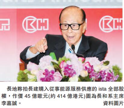 【香港商報网訊】記者鄺偉軒報道:長實地產(1113)夥拍長江基建(1038)購入從事能源服務供應的依斯塔(ista Luxemburg GmbH,下稱ista)全部股權,作價45億歐元(約414億港元) 。交易須待長地及長建的獨立股東同時批准,方可成事。