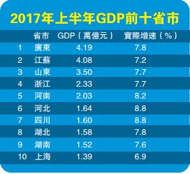 數據顯示,2017上半年排名前兩位的廣東和江蘇GDP已超過4萬億元,位於第三位的山東省GDP為3.5萬億元。截至目前,全國進入「萬億俱樂部」的省份至少有14個。