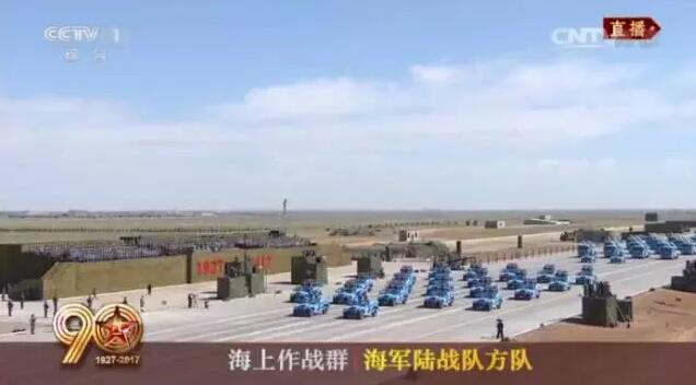 海軍陸戰隊方隊,領隊為孔軍少將。孔武有力的男兵,英姿颯爽的女兵,帶來了大海的氣魄,也把這支兩棲作戰力量的雄風帶到了受閱現場。