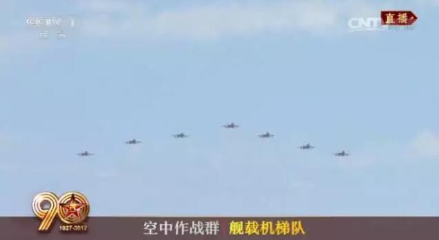 7架殲-15編成艦載機梯隊接受檢閱。殲-15是我國自主研發的首型固定翼艦載多用途戰鬥機,也是航母編隊核心作戰打擊力量。