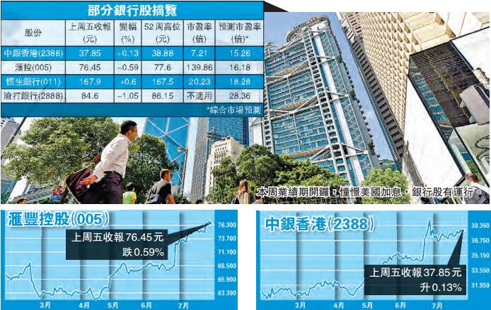 本周業績期開鑼,銀行股打頭陣,控(005)、恒生銀行(011)今日將公布業績。縱使美國加息步伐放緩,但市場預期美國聯儲局最快於9月開始進行縮表,收水動作一出,即使下半年美國加息預期降至一半,但收緊貨幣環境,環球息率也會向上,加息自然有利於銀行股,想趁大市略回吐,撈績優銀行股,作中長線持有,推薦控及中銀香港(2388)。 香港商報記者 林德芬