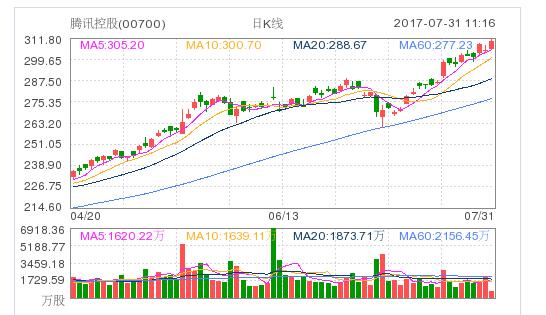 騰訊今早高開後震蕩上漲,盤中一度漲2%,報311.2港元,股價再創上市新高。截至發稿,騰訊漲1.7%,報310港元,成交額15.36億港元,成交量497.73萬股,市值逼近3萬億港元。
