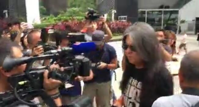 「珍惜群組」今早在區域法院門外示威,高呼「嚴懲黑金漢奸、香港才有前途」等口號,有群組成員更指長毛「起碼要坐廿年」。 區域法院經過七天審訊後,主審法官李運騰今日10時,裁定罪名不成立。