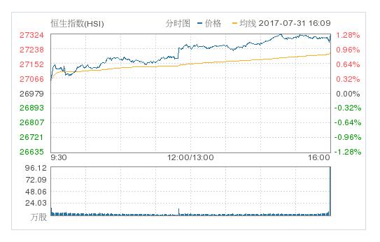 上周五美股三大指數個別發展,道指連續三天創收市新高。經濟數據方面,美國第二季度GDP增速提高至2.6%。恒生指數今早高開0.26%,開盤後漲幅擴大,最高漲逾200點,午後港股漲幅繼續擴大,最高漲近300點,高見27324點,再創逾兩年新高。截至收盤,恒生指數漲1.28%,報27323.99點;國企指數漲0.67%,報10827.84點;紅籌指數漲0.82%,報4267.33點。大市成交額869.11億。