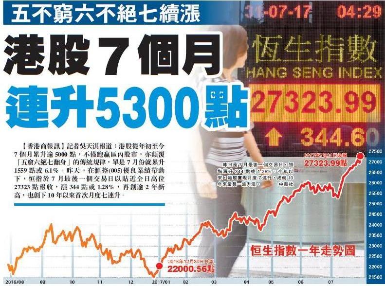 【香港商報网訊】記者吳天淇報道:港股從年初至今7個月累升逾5000點,不僅跑贏區內股市,亦顛覆「五窮六絕七翻身」的傳統規律,單是7月份就累升1559點或6.1%。昨天,在汇控(005)優良業績帶動下,恒指於7月最后一個交易日以貼近全日高位27323點報收,漲344點或1.28%,再創逾2年新高,也創下10年以來首次月度七連升。