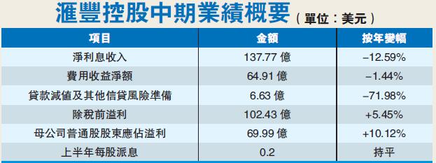 【香港商報网訊】記者鄺偉軒報道:受惠貸款減值準備大幅減少,汇控(005)上半年列帳基準除稅前溢利為102.43億美元,按年增長5.45億美元;母公司普通股股東應占溢利為69.99億美元,按年增長10.11%,派第二次中期股息0.1美元。汇控同時宣布,再次回購股份,金額最多20億美元(156億港元)。