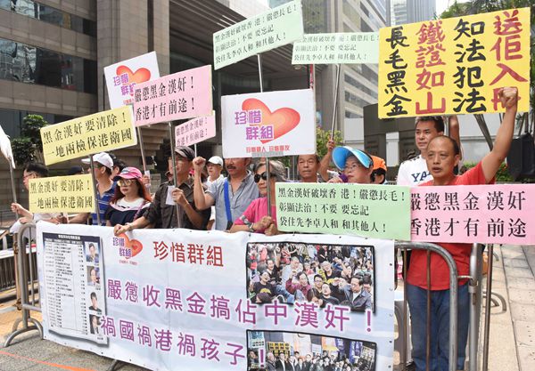另一方面,昨早開庭前,「珍惜群組」約20人在法院門外示威,他們高叫口號,手持「長毛黑金、鐵證如山、知法犯法、送距入冊」等橫額和標語,希望法庭能公正地嚴懲收「黑金」的人。